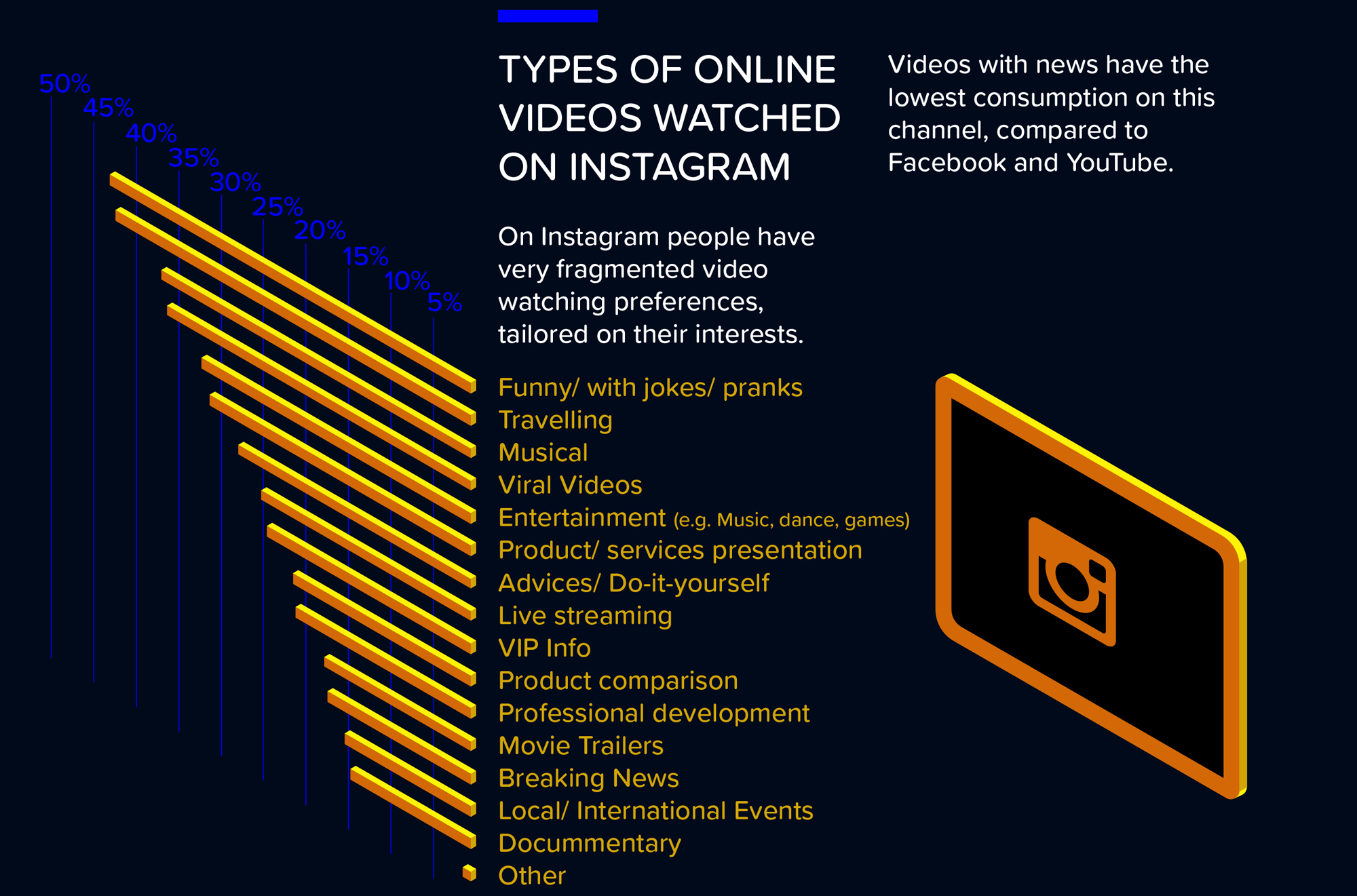 Pe Instagram, în funcție de interesele lor, românii au preferințe diferite. În topul acestora se află, încă o dată, clipurile amuzante și cele despre călătorii/vacanțe (43%). Pe această platformă se poate observa o afinitate mult mai mică pentru videoclipurile cu știri comparativ cu Facebook și YouTube.