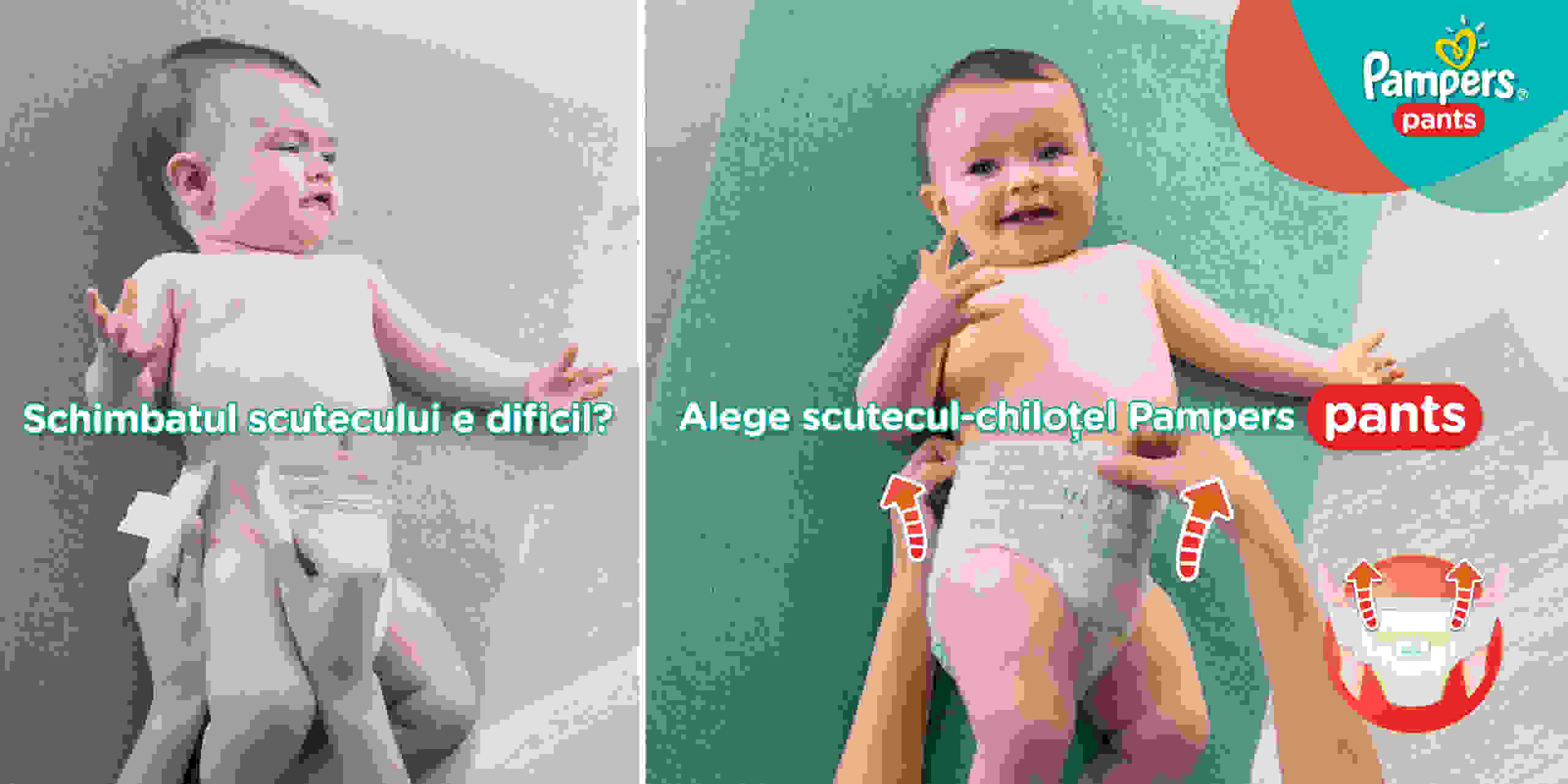 De acum, tu și micuțul tău vă puteți juca fără griji, oriunde – totul este mai ușor cu Pampers Pants, scutecul-chiloțel care se pune dintr-o singură mișcare, chiar și atunci când bebe merge de-a bușilea sau stă în picioare! Bebe se va simți confortabil Pampers Pants – banda elastică a scutecului – chiloțel oferă fixare perfectă, flexibilitate și confort, indiferent de activitățile celui mic. Pampers Pants este ajutorul de nădejde atunci când micuțul tău începe să descopere lumea din jurul lui.