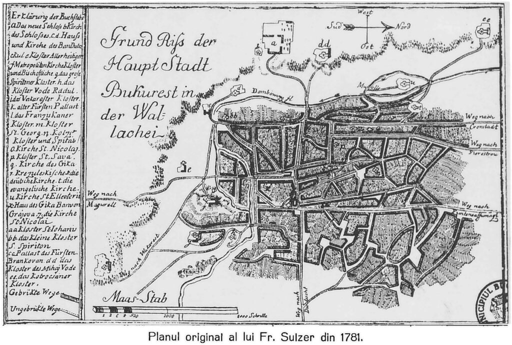 Comandanții militari aveau nevoie să cunoască vecinii sau locurile în care urmau să se desfășoare confruntările armate, iar hărțile erau cel mai facil instrument. Așa că asta a făcut și Sulzer și a identificat pe harta sa șase străzi principale şi aproximativ 30 de clădiri: biserici, mânăstiri, Curtea Domnească, hanuri şi case. Un poligon neregulat ce gravitează în jurul Curții Domnești și este traversat de o Dâmboviță capricioasă.