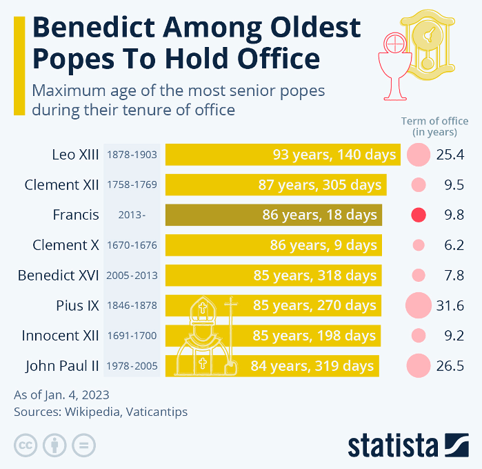 Benedict al XVI-lea a murit în 31 decembrie la vârsta de 95 de ani. Numele său la naștere a fost Joseph Aloisius Ratzinger. Acesta a renunțat la scaunul papal în 28 februarie 2013, când avea aproape 86 de ani. Papa Francis și-a sărbătorit vârsta de 86 de ani în 17 decembrie, iar astfel a devenit cel de-al treilea cel mai în vârsta pontif suprem din istorie care este încă pe scaunul papal.