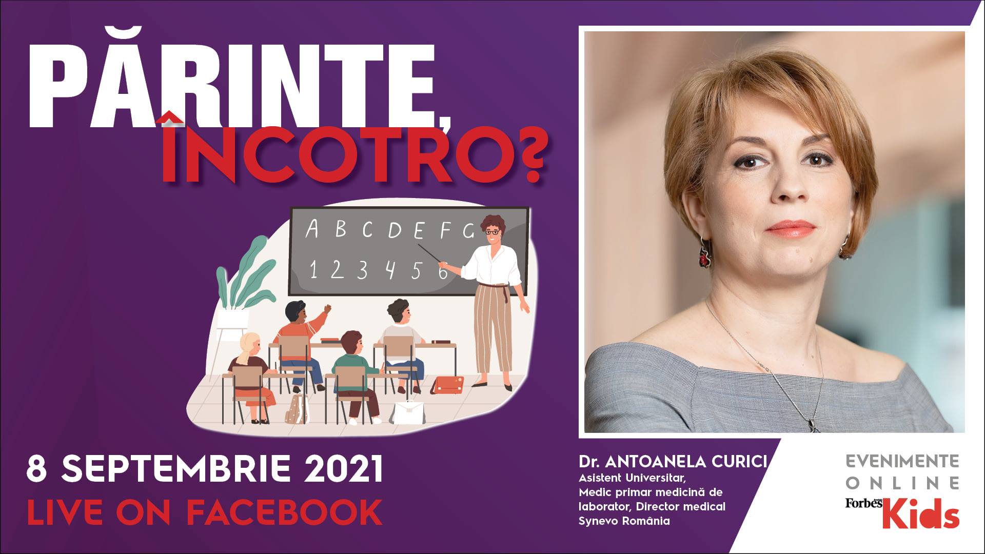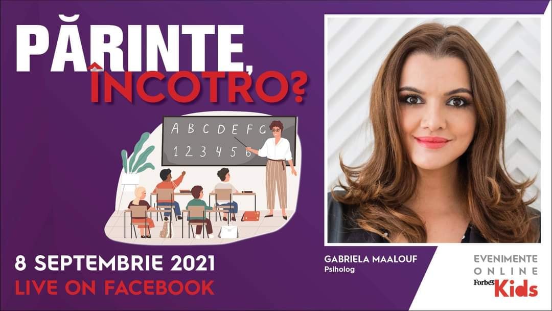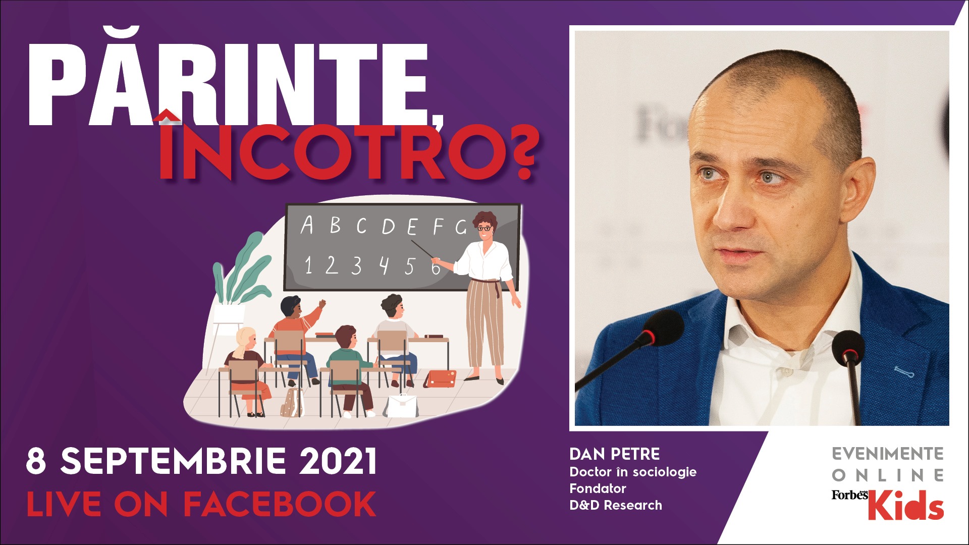 Miercuri, 8 septembrie, a avut loc o nouă ediție „Părinte, încotro?”, a patra la număr, de data aceasta cu o tematică dedicată reîntoarcerii la școală, grădiniță, colectivitate. Alături de noi au fost doamna . – asistent universitar, medic primar medicină de laborator, director medical Synevo România; – psihoterapeut & consilier școlar; și – doctor în sociologie și fondator al companiei de cercetare D&D Research. Moderator: Raluca Michailov, Owner Forbes România.