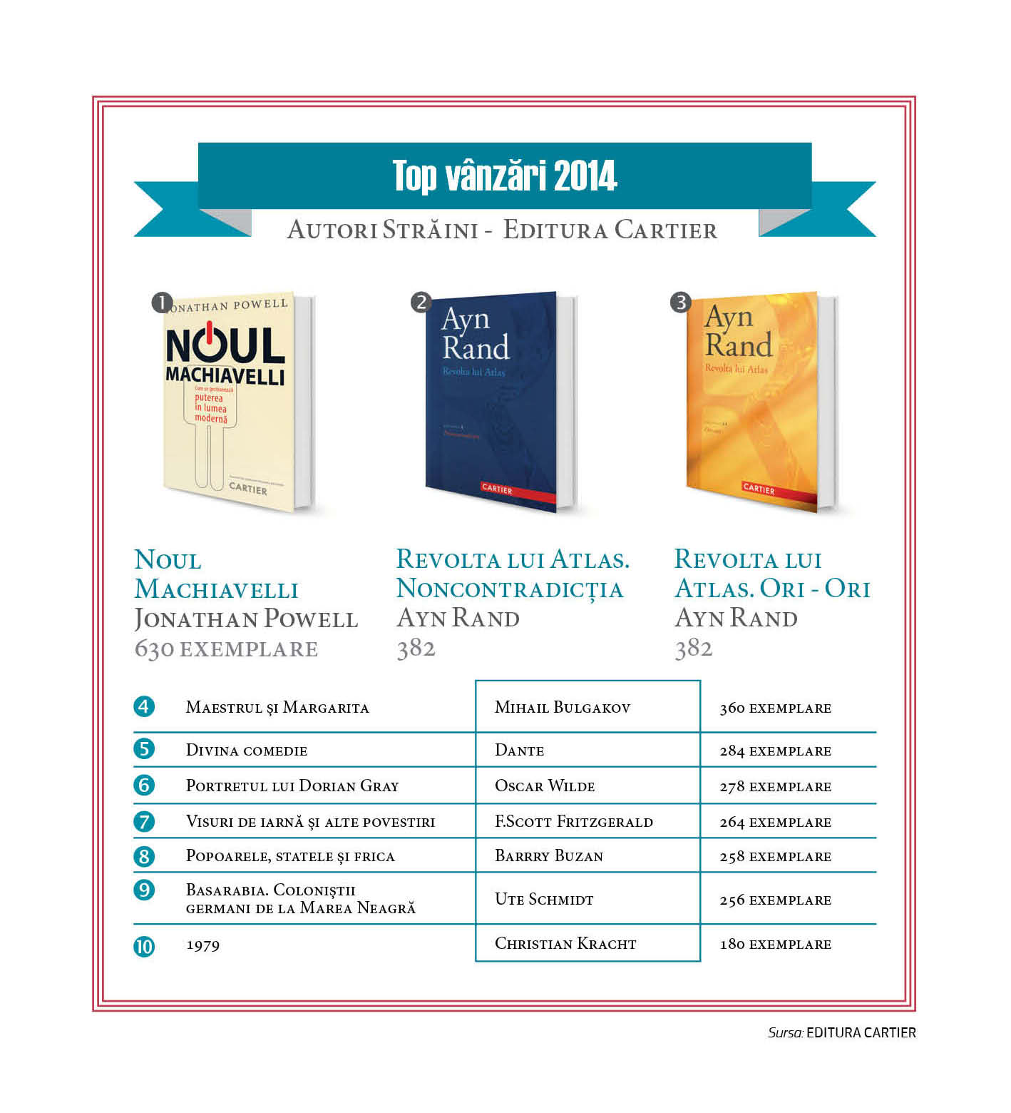 În acest top a intrat un titlul surpriză, care nu se regăsește în celelalte rețele de difuzare: „Cea mai frumoasă poveste”, un volum de istorie editat de Curtea Veche și semnat de Adrian Cioroianu. (Probabil că profesorul Cioroianu le-a recomandat studenților săi să cumpere această carte.)