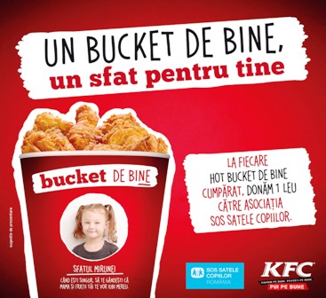 În perioada 1 martie – 31 decembrie a.c., 1 leu din prețul fiecărui „Bucket de bine” cumpărat va merge către familia SOS sponsorizată de KFC România, din care fac parte 5 copii cu vârste între 7 și 11 ani, îngrijiți de o mamă socială.
