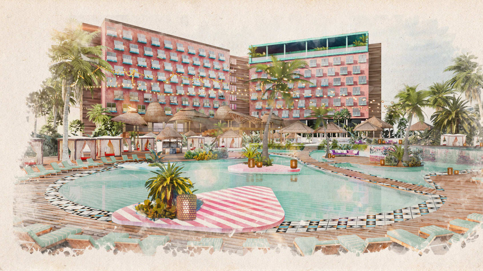 Cum va arăta noul hotel al lui Pharrell? Din acuarela furnizată presei de proiectanți se poate deduce că ambientul va fi similar celui din The Goodtime Hotel din Miami, unul din cele două proiecte în care Pharrell Williams și David Grutman sunt parteneri, inaugurat în aprilie anul trecut.
