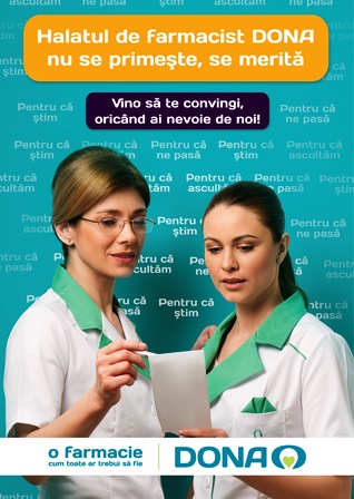 Elementul principal în jurul căruia este construită întreaga campanie creativă este halatul de farmacist Dona. Pentru farmaciști acesta este un simbol de mândrie, pentru pacienți este garanția unui serviciu impecabil.