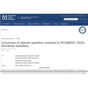 RCS informează investitorii și acționarii că, la data de 28 noiembrie 2019, RCS&RDS, denumită în continuare „Cesionarul” și Digital Cable Systems S.A., AKTA Telecom S.A., respectiv ATTP Telecommunications S.R.L., denumiți în continuare împreună „Cedenții”, au încheiat contracte (împreună „Contractele”) având că obiect operarea de către RCS&RDS a activelor prin care se furnizează servicii de comunicații electronice către clienții de tip rezidențial.