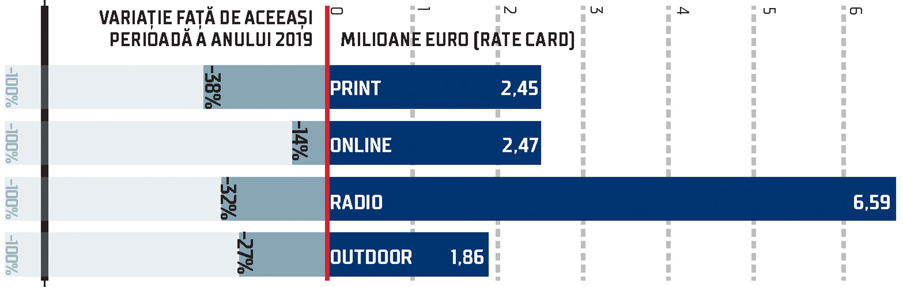 În total, pe cele patru suporturi media (radio, print, outdoor, online), scăderea volumului de publicitate a fost de 30% față de aceeași perioadă a anului 2019. Este o contracție importantă pentru începutul crizei generată de pandemia COVID – 19.