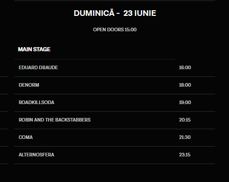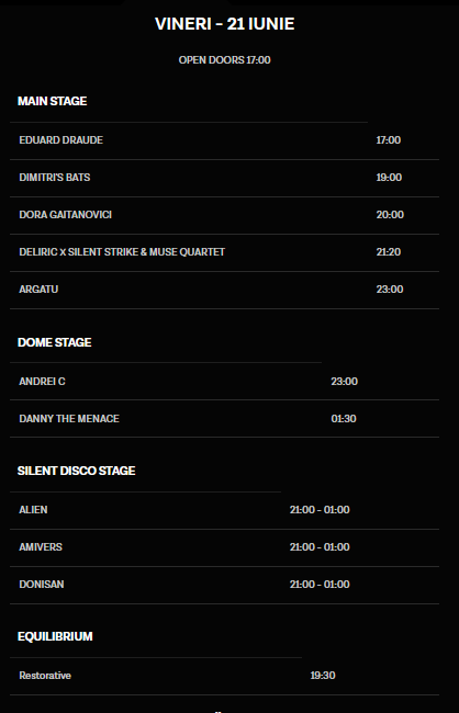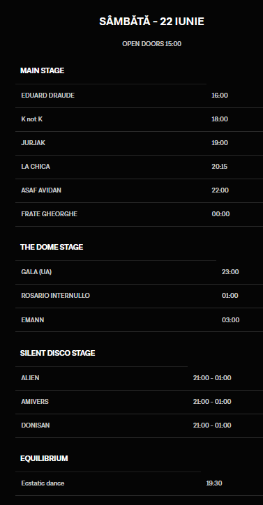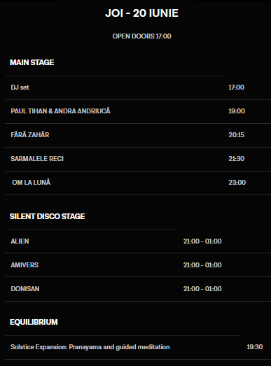 Cele trei scene găzduiesc artiști invitați să împărtășească cu publicul iubirea pentru muzică, iar în rândul concertelor susținute se numără: Asaf Avidan, Alternosfera, Deliric & Silent Strike, COMA, Argatu, om la lună, Jurjak, La Chica, Frate Gheorghe și mulți alții. Programul complet pe ore e disponibil pe website-ul festivalului.