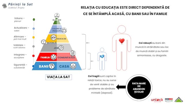 În același timp, studiul introduce un instrument util pentru înțelegerea părinților de la sat și a mecanismelor care îi motivează să-și susțină copiii la școală, diferențiind între 5 tipologii parentale: traumatic, compensatoriu, ambițios, progresiv și armonios. Cel mai des întâlnite în mediul rural sunt cele traumatice și compensatorii, cu o viziune pesimistă, dar și cele bazate pe dragoste pură și necondiționată.