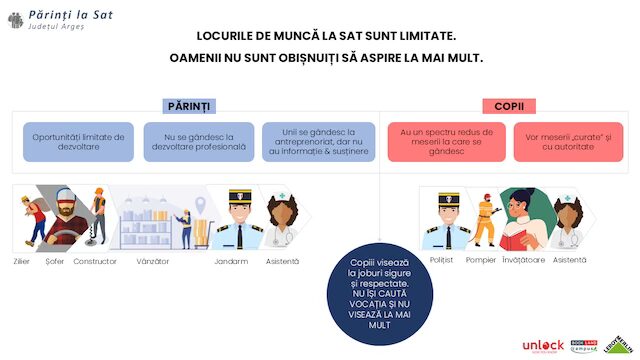 A avea un loc de muncă stabil, bine remunerat, care se bucură de prestigiu social este aspirațional. Și totuși, oamenii nu-și încurajează copiii să viseze mai mult decât ceea ce știu că funcționează. Maximul la care aspiră pentru copii sunt joburi sigure, în administrația publică – polițist, pompier, învățător, asistent – iar cei care spun că-și doresc să-și vadă copiii la facultate nu știu ce anume vor studia aceștia. Își spun însă, că o diplomă le deschide copiilor ușa spre locuri de muncă mai bune: ʻla birou, nu cu cârca, în ploaie’. Perspectiva părinților argeșeni trebuie privită și în contextul percepției la nivel național, unde doar 34% dintre români cred că învățământul îi pregătește pe copii pentru viață într-o mare sau foarte măsură, în timp ce 7 din 10 români care au copii sau cunoscuți absolvenți de liceu & facultate spun că le e greu să-și găsească locuri de muncă, neavând experiență practică (59%) sau acces la oportunități în zonă (42%).