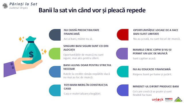 Respondenții spun că lipsa banilor le creează un sentiment de nesiguranță și teamă căci, în Argeșul rural, oportunitățile de lucru nu sunt atât de variate și sigure: ʻnu e ca la Mioveni unde ai acces la locuri de muncăʼ. De aceea, mulți săteni aleg să plece în străinătate. În lipsa predictibilității financiare, majoritatea se axează pe imediat (ʻce-i în mână nu-i minciună’) și rareori fac planuri pe termen lung. În mod paradoxal, părinții cu cei mai puțini bani au tendința de a ceda presiunilor copiilor pentru a cumpăra jucării sau haine de brand, comparativ cu cei mai stabili financiar, care sunt mai chibzuiți. Cea mai mare diferență între cei care reușesc să facă bani și cei care nu reușesc rămâne atitudinea. Cei care suferă de deprivare financiară cred despre ei că ʻnu potʼ și despre mediu că ʻnu se poateʼ.