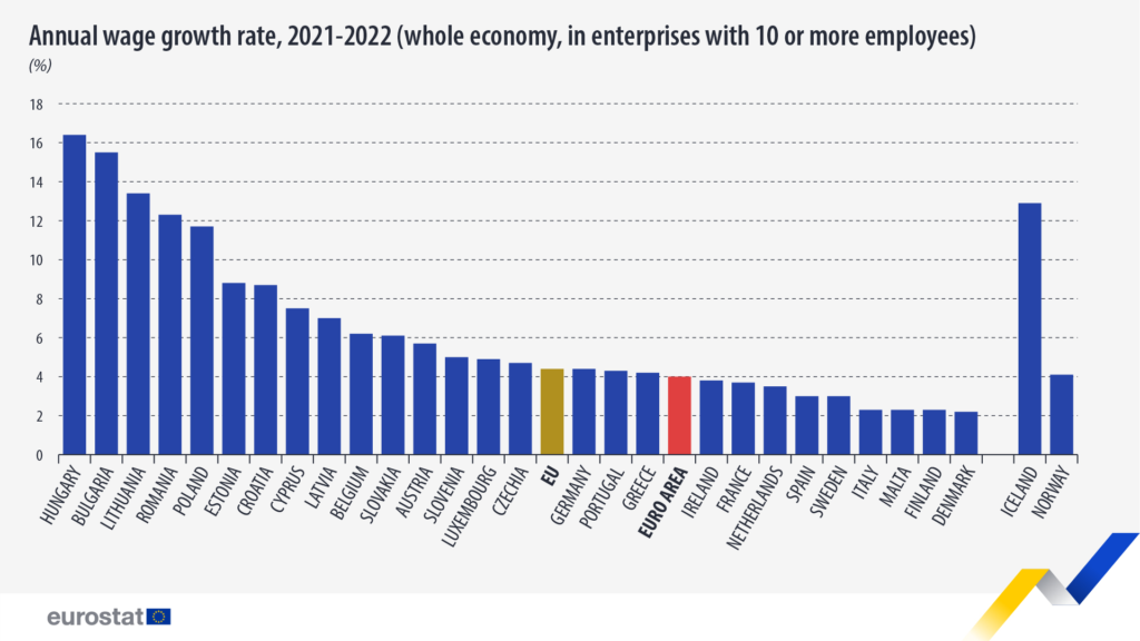 În zona euro, plata pe oră și salariile au crescut în rândul tuturor statelor membre. Au crescut cel mai puțin în Italia, Malta și Finlanda (+2,3% fiecare) și cel mai mult în Lituania (+13,4%), Estonia (+8,8%) și Croația (+8,7%).