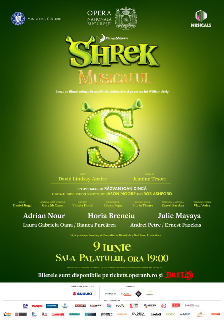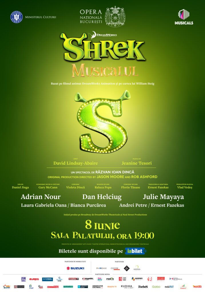 Shrek, una dintre cele mai faimoase și emoționante povești din toate timpurile, câștigătoare a premiului Oscar pentru cel mai bun film animat, vine în premieră în România sub forma musicalului Shrek, care va avea loc pe scena Sălii Palatului pe 8 și 9 iunie. Din distribuție fac parte artiști consacrați precum Horia Brenciu și Dan Helciug, care vor intepreta rolul căpcăunului morocănos, dar simpatic, alături de Oana Laura Gabriela și Bianca Purcărea în rolul Fionei, Adrian Nour (Măgărușul), Julie Mayaya (Dragonița), Andrei Petre și Ernest Fazekaș (Lord Farquuad). Spectacolul este produs de Opera Națională București și Musicals.ro, aceeași echipa din spatele altor producții de succes precum “Fantoma de la Operă”, “Mamma Mia” și “My Fair Lady”.