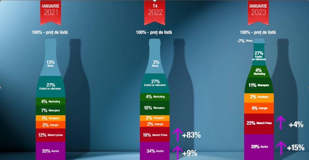 Potrivit reprezentanților Asociației producătorilor și importatorilor de băuturi spirtoase din România, în ultima perioadă, costul materiilor prime și al materialelor s-a mărit cu valori cuprinse între 30% și 80%, punând deja o mare presiune pe costurile de producție. O creștere suplimentară cu aproximativ 15% (inflația anuală prognozată pe anul 2022) de la 1 ianuarie 2023 ar determina o creștere a prețului la raft al băuturilor spirtoase cu concentrație alcoolică de 40% grade cu minimum 4,5 lei/litru.
