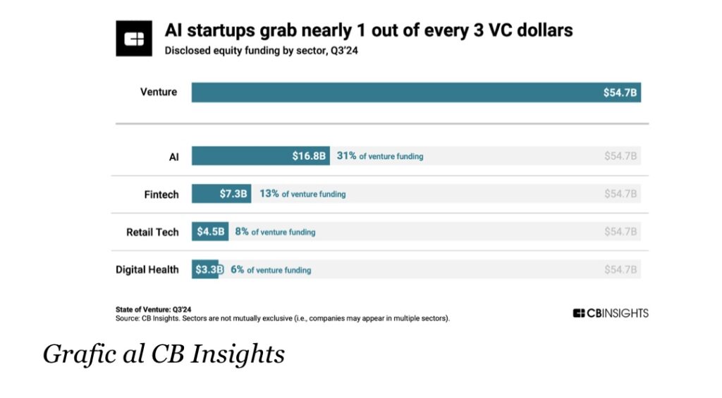 Potrivit aceleiași surse, start-up-urile AI atrag aproape o treime (31%) din toate finanțările de capital de risc în prezent, ceea ce reprezintă a doua cea mai mare cotă din istorie, după 35% înregistrată în al doilea trimestru al anului 2024.