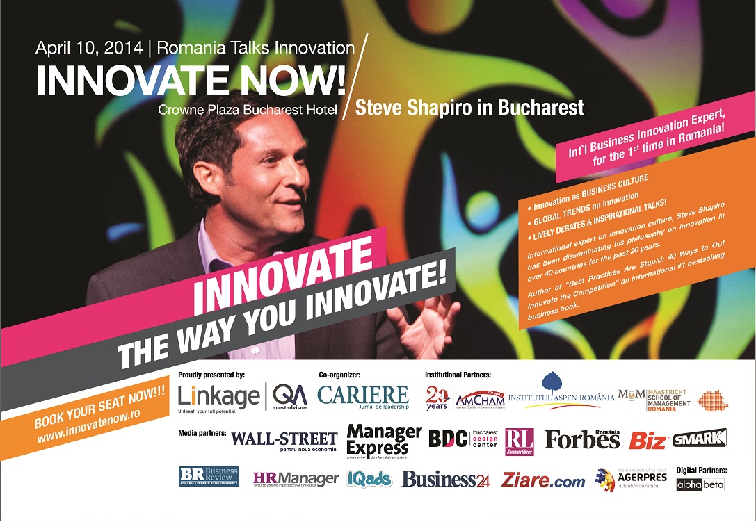 „Innovate Now!” este o conferința de o zi ce cuprinde 3 sesiuni de discuții interactive și dezbateri cu accent pe inovație în domeniul afacerilor în contextul trendurilor globale. Sesiunea din deschidere a evenimentului este dedicată liderilor din diverse industrii locale care își vor împărtăși ideile și experiențele legate de inovație pentru a face loc ulterior panelului de discuții inițiat de Aspen Institute România. Sesiunea principală a conferinței îi este rezervată invitatului special, Steve Shapiro, care va vorbi managerilor și antreprenorilor despre inovație, cu accent pe modalităţile concrete şi inovatoare prin care mediul de business se poate revigora.