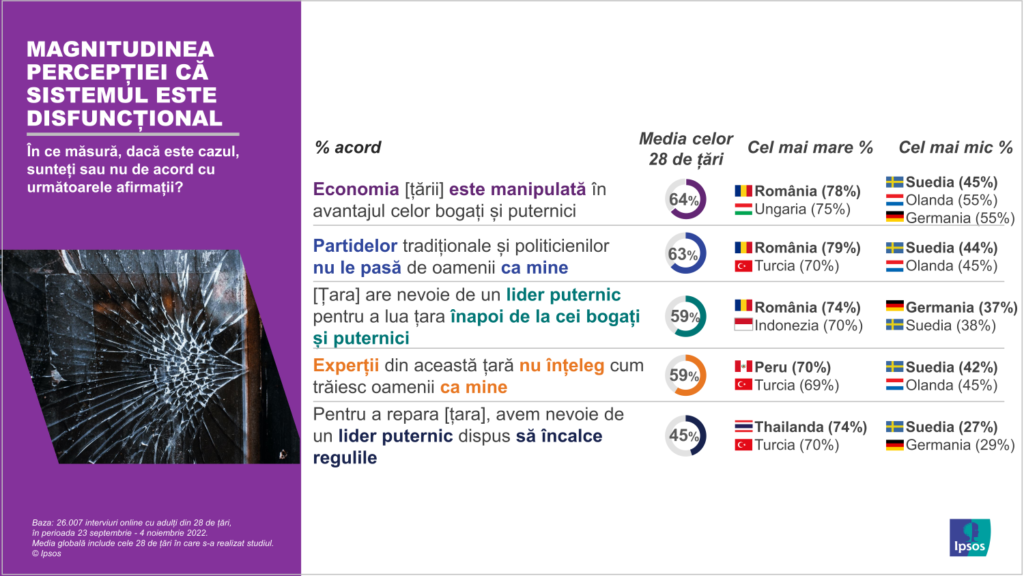 În medie, în rândul celor 28 de țări investigate, 6 din 10 cetățeni sunt de părere că economia țării este deturnată în folosul celor bogați și puternici, că partidelor politice și politicienilor nu le pasă cu adevărat de cetățeni, că este nevoie de un conducător capabil să ia țara înapoi de la cei bogați și puternici, dar și că experții nu înteleg realitățile cu care se confruntă oamenii.