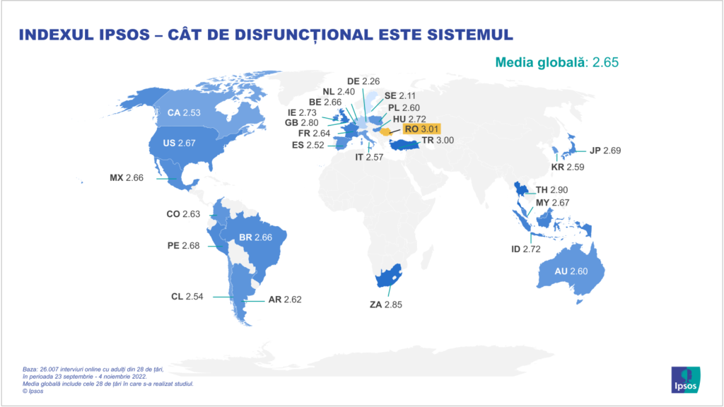 Deși părerea că sistemele politice și economice sunt disfuncționale este dominantă în majoritatea țărilor participante la studiul Ipsos, România conduce detașat, 8 din 10 conaţionali exprimând această opinie.