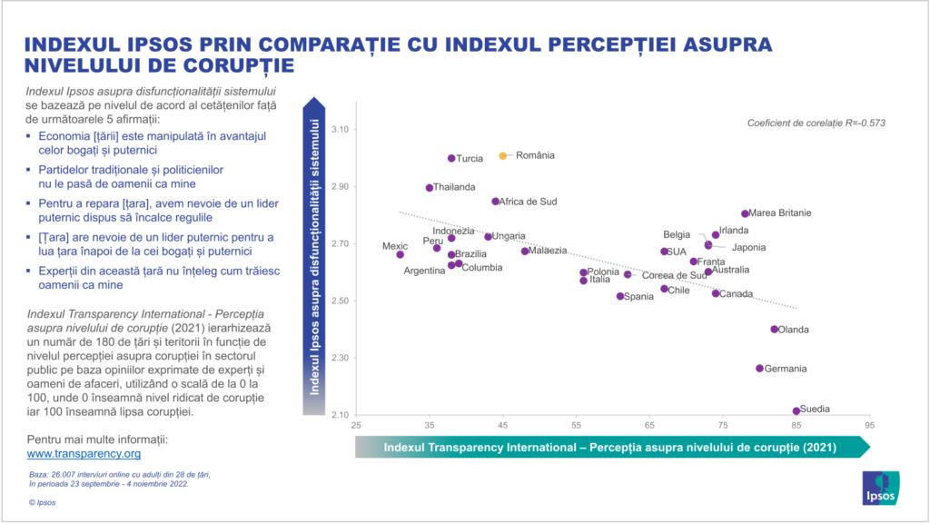O comparație între Indexul de percepție asupra nivelului de corupție (CPI) al Transparency International și Indexul Ipsos de disfuncționalitate a sistemului, măsurate în fiecare dintre cele 28 țări din studiul Ipsos, scoate la iveală o corelație strânsă între acești doi indicatori.