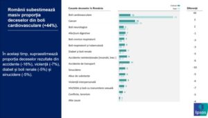 ‘Românii, la fel cu cetățenii multor altor țări, au tendința să considere că bolile insidioase, care se dezvoltă în timp și pe care, uneori, nu le vedem „venind” sau cu care putem trăi uneori o perioadă bună de timp, sunt responsabile într-o mult mai mică măsură de rata deceselor comparativ cu cauze mai bruște, mai brutale, care nu sunt posibil de anticipat, care vin din „afara” noastră și care fac subiectul emisiunilor de știri într-o proporție mai mare, tocmai din cauza caracterului lor perceput mai dramatic.’, precizează Alina Stepan, Country Manager Ipsos.