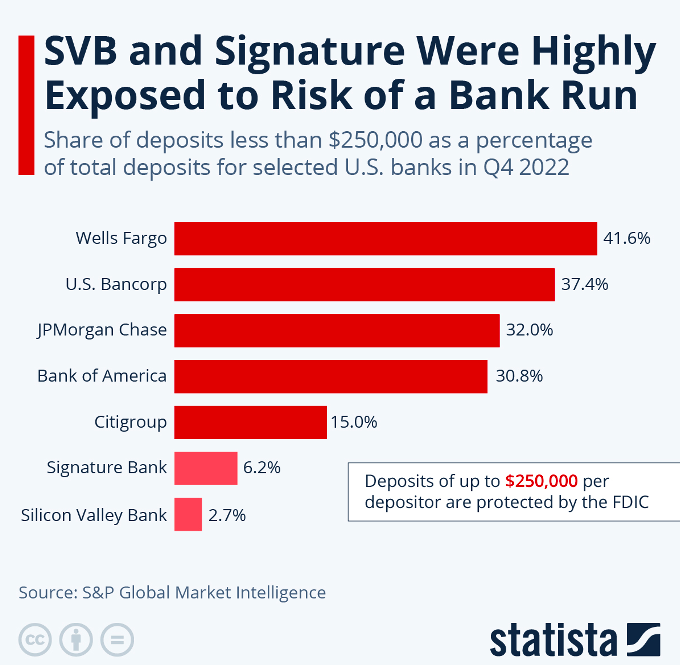Pentru că SVB avea în portofoliul de clienți mai multe startup-uri decât alte companii sau clienți privați, vasta majoritate a depozitelor depășeau limita de $250,000 asigurată de FDIC, ceea ce înseamnă că acesta erau (parțial) neprotejate. Pentru că știau acest lucru, clienții SVB au reacționat rapid prin retragerea banilor depuși la bancă la cel mai mic semn al vreunei turbulențe. Potrivit informărilor oficiale, joia trecută au fost retrase din depozite $42 de miliarde. Colapsul băncii a fost inerent.