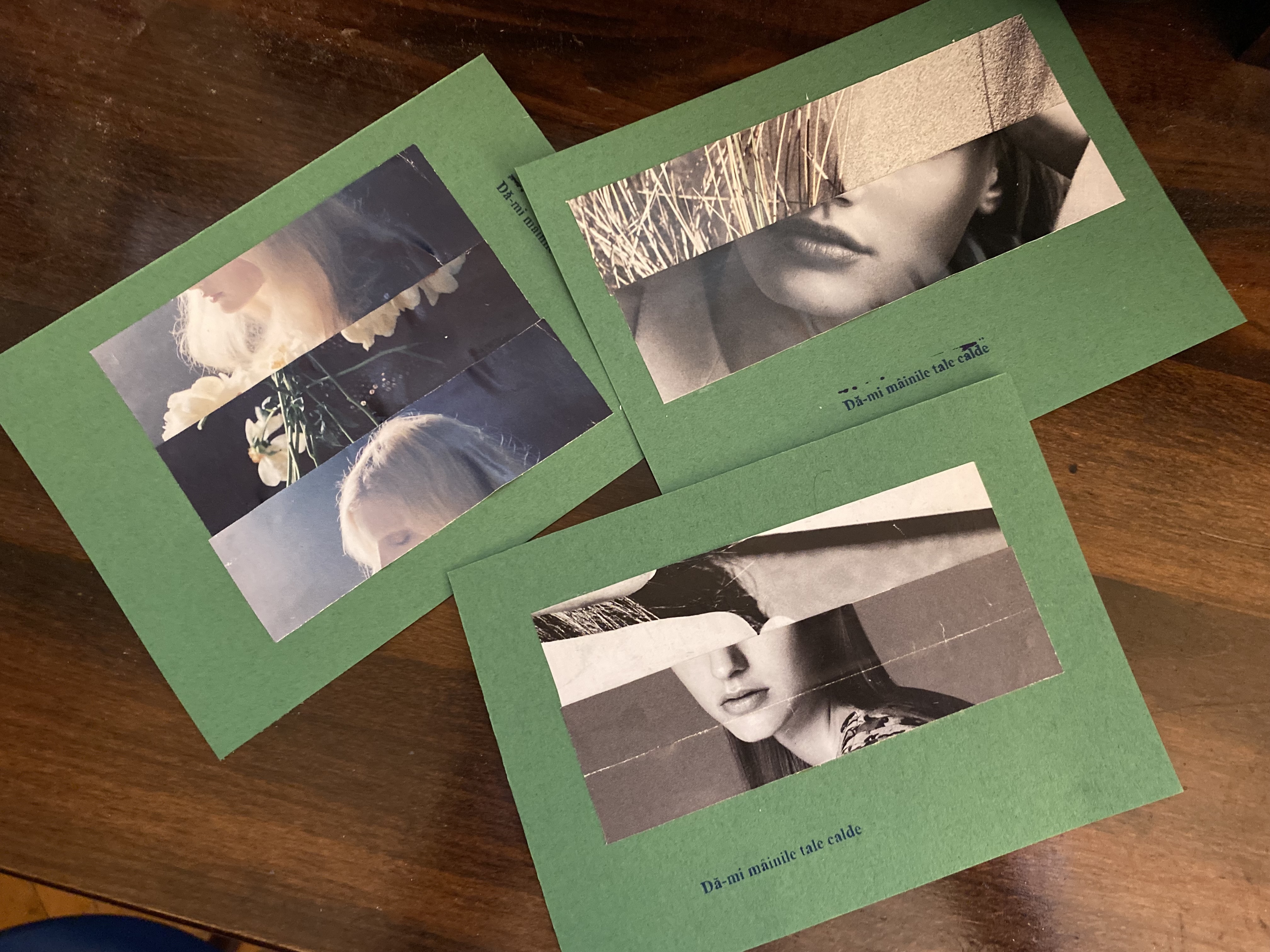 Eu sunt o paseistă și un om care crede, din acest unghi, că multe lucruri din trecut ar trebui reintroduse în modul nostru de viață. Simt că, dacă vom pierde emoția, vom pierde mai mult decât unii își pot imagina. Mă deranjează că acest mod de a comunica online, de a trimite totul electronic a atins și zona personală, intimă, a gândurilor, a urărilor… Acestea ar fi trebuit, din punctul meu de vedere, să rămână nealterate de tehnologie. Revenind la ideea mea, dincolo de această motivație, mai există una, aceea pentru care unii dintre noi, cei poate mai sensibili decât ar fi cazul, mai nostalgici, mai introvertiți, mai outside the box, sunt întâmpinați uneori cu ostilitate de cei din jurul nostru. Așadar, „Dă-mi mâinile tale calde”, acest îndemn sub care am conceput seturile de cărți poștale, este de fapt o nevoie, o dorință, un semnal de atragere a atenției pentru a fi primiți cu bunăvoință, cu toleranță, cu căldură. Setul conține 17 cărți poștale, 16 fotografii și un desen, toate reprezentând simbolic solitudinea la care societatea ne condamnă indirect. Sunt imagini ce aparțin unor ani și etape de viață când m-am simțit singură, neînțeleasă, nevalorificată (la modul corect, nu voiam mai mult, dar nici mai puțin). Am gândit acest set ca un kit de profilaxie emoțională pentru cei care, ca mine, vor să trimită acest mesaj lumii. Chiar astăzi am lansat și am postat pe Facebook și Instagram și o serie limitată de cărți poștale-colaj, realizate manual, care pot fi oferite alături de cadouri celor dragi. Fiecare este unică și poate fi, în opinia mea, un cadou artsy, la fel ca și celelalte colaje pe care le fac. Muzeul Guggenheim documentează arta colajului ca pe un mod de manifestare artistică asociată începuturilor modernismului, ce presupune un concept mult mai complex decât simpla alăturare a unor elemente pentru a forma un tot. Sper ca această artă să ajungă să fie privită și în România la fel.