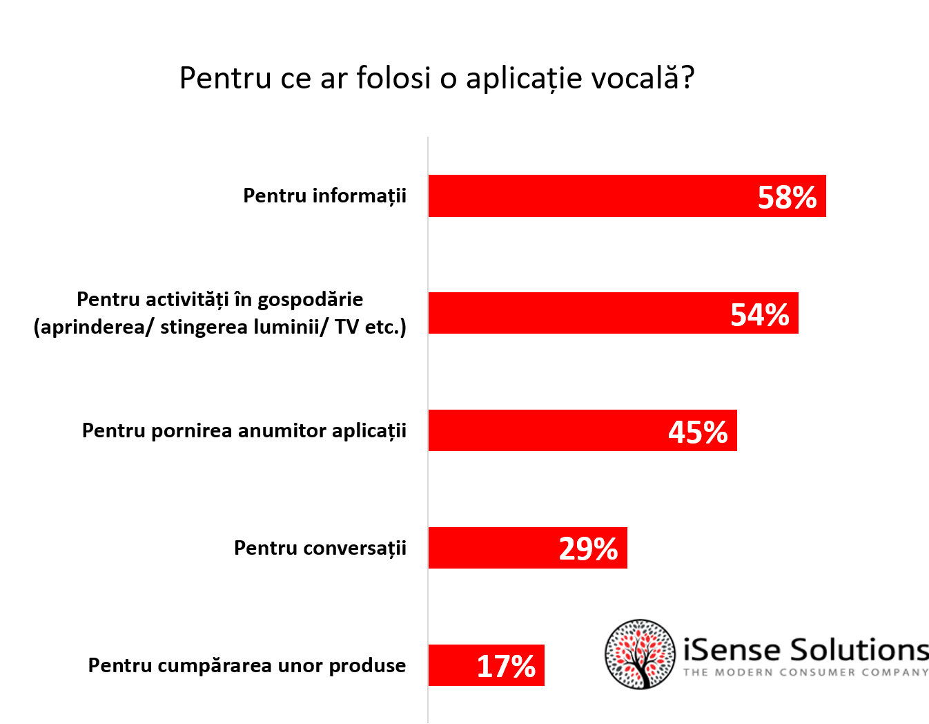 Consumatorii ar folosi o aplicație vocală pentru căutarea de informații (58%), activități în gospodărie precum aprinderea/stingerea luminii sau a televizorului (54%), pornirea anumitor aplicații (45%), pentru conversații (29%), pentru cumpărarea anumitor produse (17%).