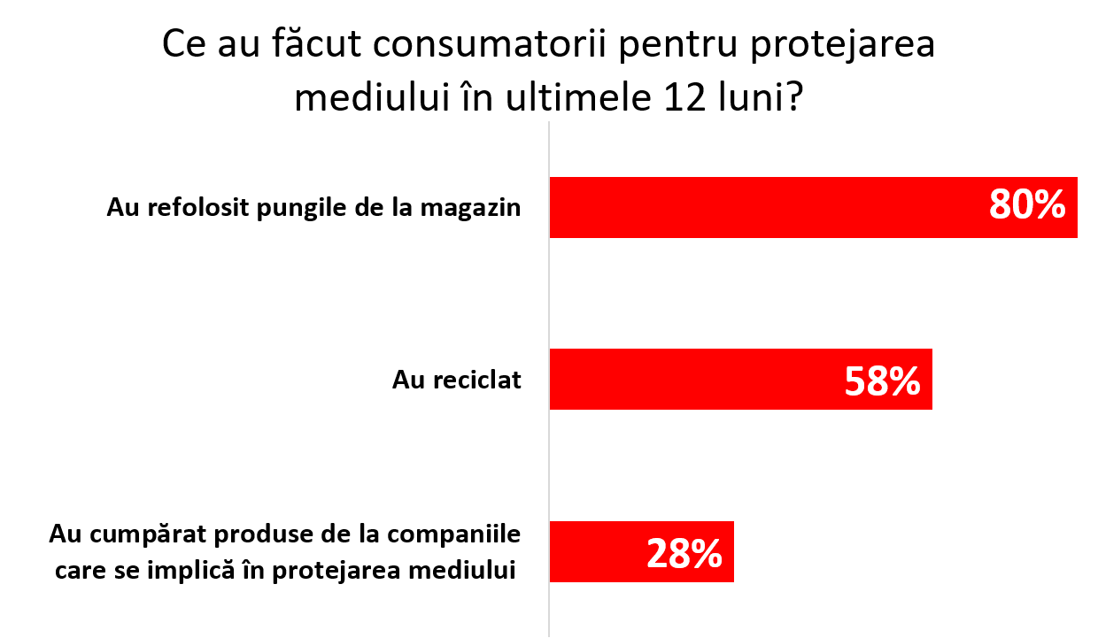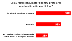 Astfel, în 2019, 8 din 10 persoane refolosesc pungile de la magazin (față de 74% în 2018), iar procentul celor care au reciclat a crescut de la 51% în 2018, la 58% în 2019. Mai mult, 28% dintre consumatori au cumpărat produse de la companiile care se implică în protejarea mediului, tendința fiind semnificativ mai mare în cazul tinerilor de 18-23 ani (41%).