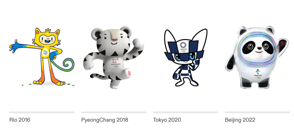 În 2014, o competiție organizată de Rusia în așteptarea Jocurilor de iarnă de la Soci a înregistrat peste 24.000 de desene. Câștigătorii, un trio de mamifere arctice menite să reprezinte cele trei locuri de pe podiumul olimpic, au fost aleși printr-un vot public cu rezultatele difuzate la televiziunea rusă. În urmă cu zece ani, agenția de design Iris a produs doi extraterestre ciclopi argintii pentru a inaugura Jocurile de la Londra.