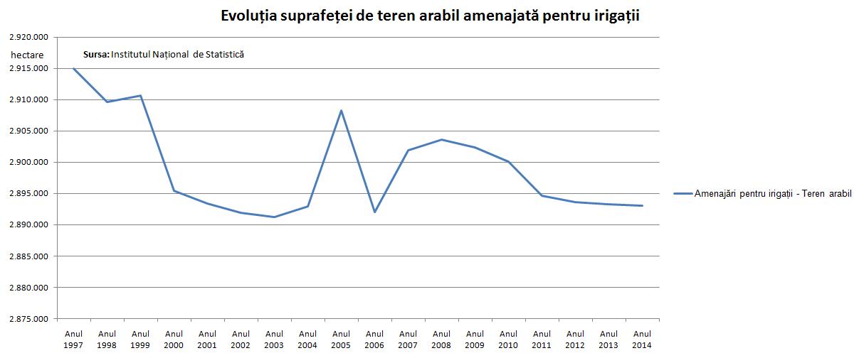 Suprafața de teren arabil amenajat pentru irigații a scăzut după Revoluția din 1989, în principal din cauza furturilor înregistrate începând cu anul 1990. Astfel, în 1997 suprafața totală amenajată pentru irigații era de 2.914.985 de hectare, potrivit datelor Institutului Național de Statistică (INS). Spre comparație, la sfârșitul anului trecut, suprafața totală amenajată pentru irigații era de 2.892.997 de hectare, în condițiile în care, prin PNDR 2007-2013, au fost finanțate proiecte pentru infrastructura secundară de irigații pentru o suprafață de peste 300.000 de hectare (click pe grafic pentru a vedea evoluția în perioada 1997-2014).