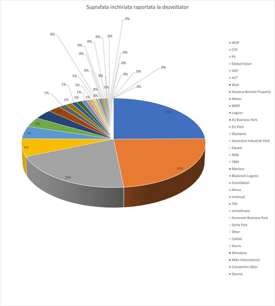 P3 Logistics Parks, ocupantul locului 3, a dezvoltat 482.000 mp, într-un singur parc logistic. Locul 4 îi revine companiei Global Vision, cu 260.000 mp dezvoltați în 6 parcuri logistice și alți 110.000 mp în construcție. Logicor (180.000 mp dezvoltați în 6 parcuri, 36.000 în construcție), VGP (171.000 mp dezvoltați în 4 parcuri și 20.000 mp în construcție) și Helios Phoenix (146.000 mp construiți în 5 parcuri, 15.000 mp în construcție) ocupă locurile 5,6 și respectiv 7.