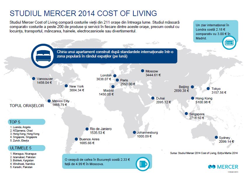 Studiul Mercer Cost of Living este unul dintre cele mai cuprinzătoare studii de acest fel din lume și este creat pentru a ajuta companiile multinaționale și guvernele să determine nivelul de remunerație pentru angajații expatriați. Orașul New York este folosit drept referință, astfel toate celelalte orașe sunt comparate cu acesta. Mișcările valutare sunt măsurate față de dolarul american.