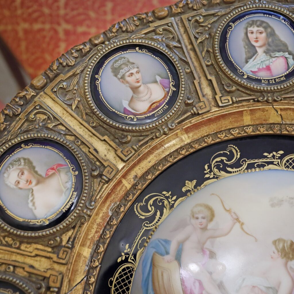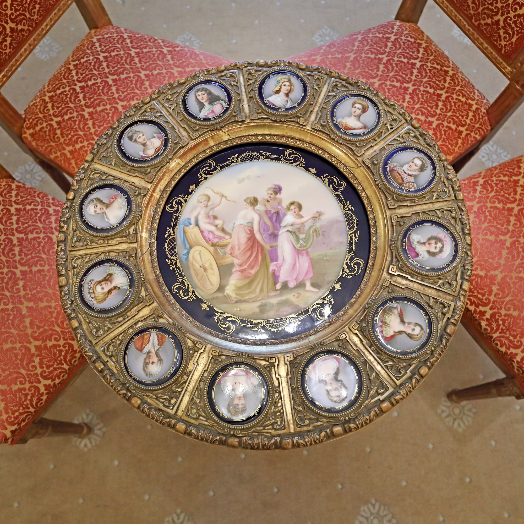Pictura centrală, „Le Triomphe De L’Amour”, îl înfățișează pe Eros în glorie, în carul tras de companioanele zeiței Venus. Gheridonul este decorat cu 12 medalioane pictate cu portrete ale doamnelor celebre ale epocii iluminismului – regina Maria Antoaneta, Pauline Bonaparte (sora lui Napoleon), Madame de Pompadour, Maria Tereza a Austriei, împărăteasa Franței, Maria Luiza a Austriei (a doua soție a lui Napoleon și mama prințului Napoleon al II-lea) etc.