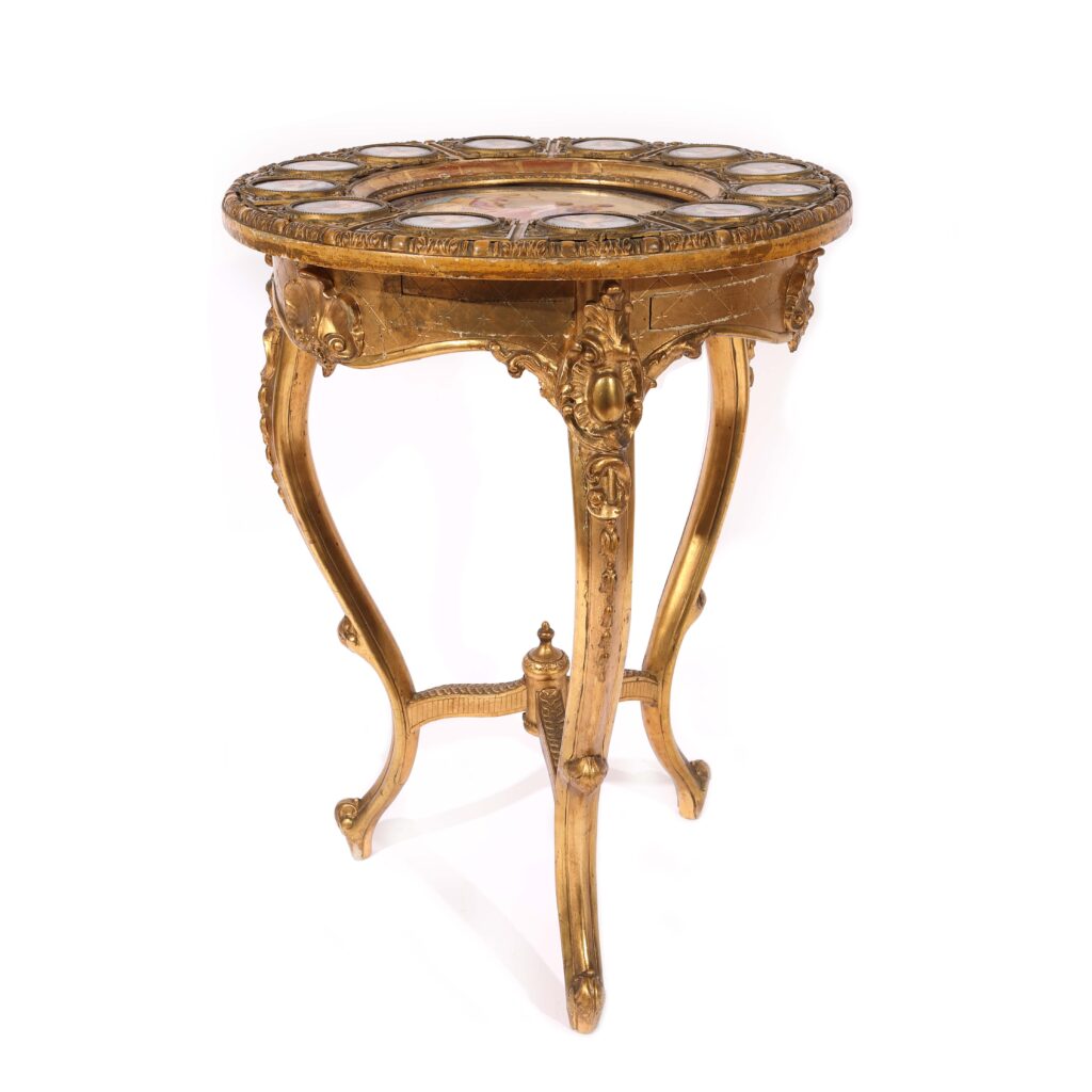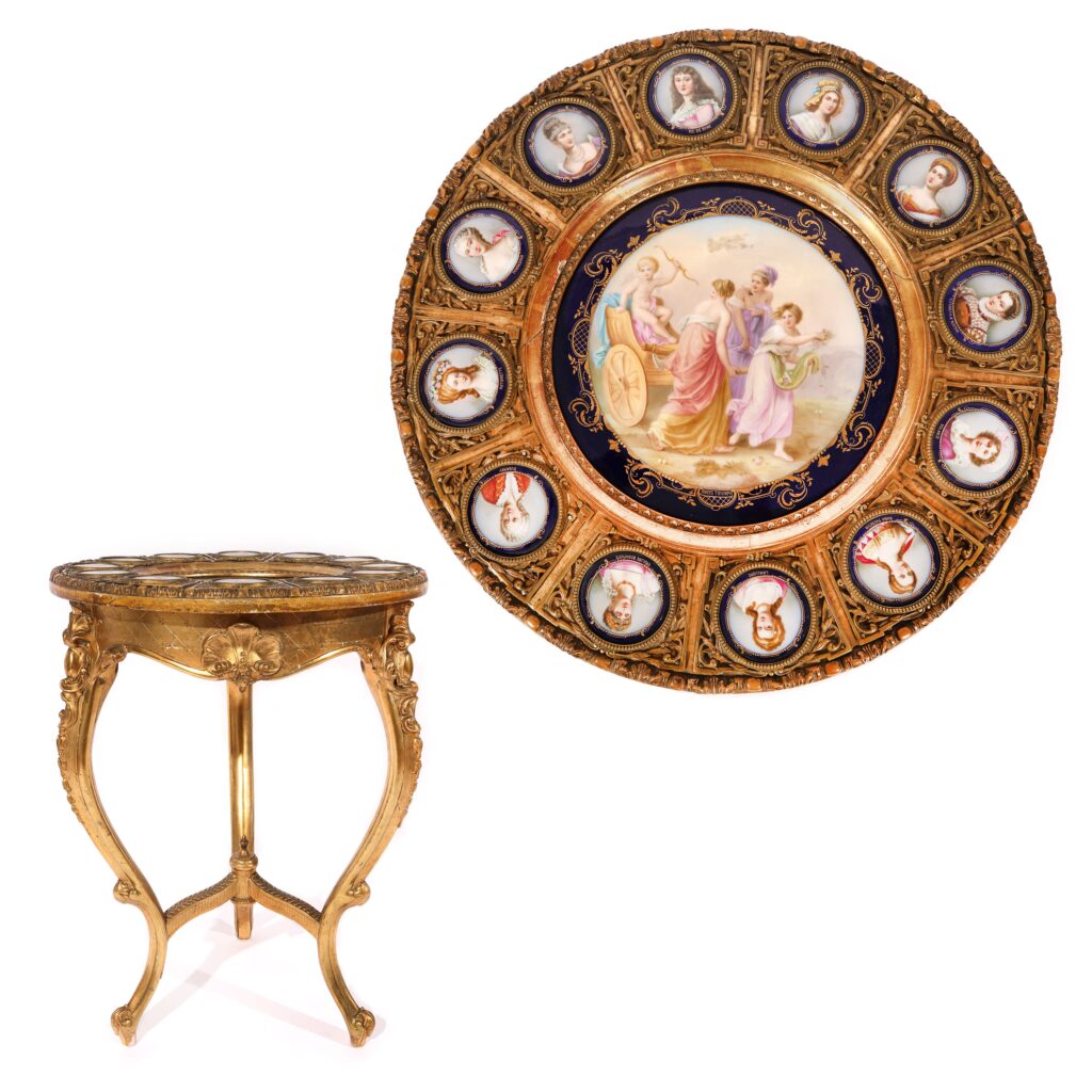 Ornat cu panouri din porțelan, pictate în maniera Angelica Kauffmann, gheridonul este o piesă de mare raritate în piața românească de artă, săracă în vestigii ale aristocrației locale de dinainte de regimul comunist.