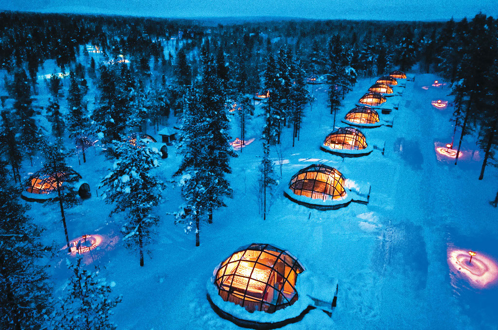 La doar 250 de kilometri nord de cercul Arctic și la mai puțin de 100 de kilometri de Rusia, Kakslauttanen este un sat finlandez pitoresc, așezat în mijlocul unei păduri de brazi din Laponia, cartierul general al lui Moș Crăciun. Nu orice sat, însă! În locul căsuțelor cochete cu perdele colorate la geam și al paturilor cu saltele umplute cu puf de gâscă, un turist dispus să plătească câteva sute de euro pe noapte poate adormi într-un pat luxos, cu așternuturi fine, în timp ce privește Aurora Boreală prin acoperișul transparent al igluului său de sticlă.