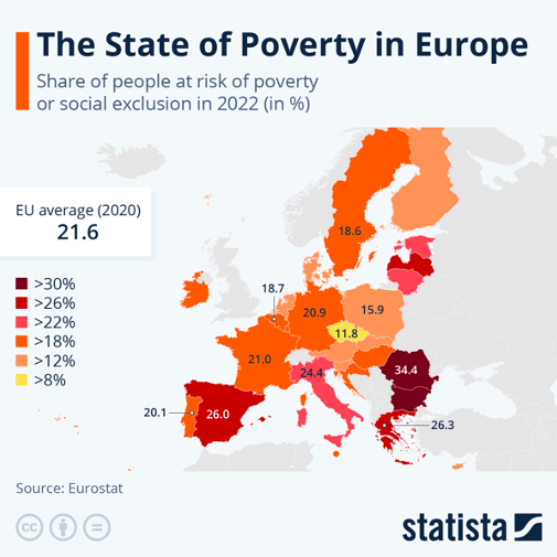 Procentul de persoane expuse riscului sărăciei sau excluziunii sociale variază semnificativ de la o țară la alta în cadrul UE. Cele mai mari valori au fost raportate în România (34%), Bulgaria (32%), Grecia și Spania (ambele cu 26%).