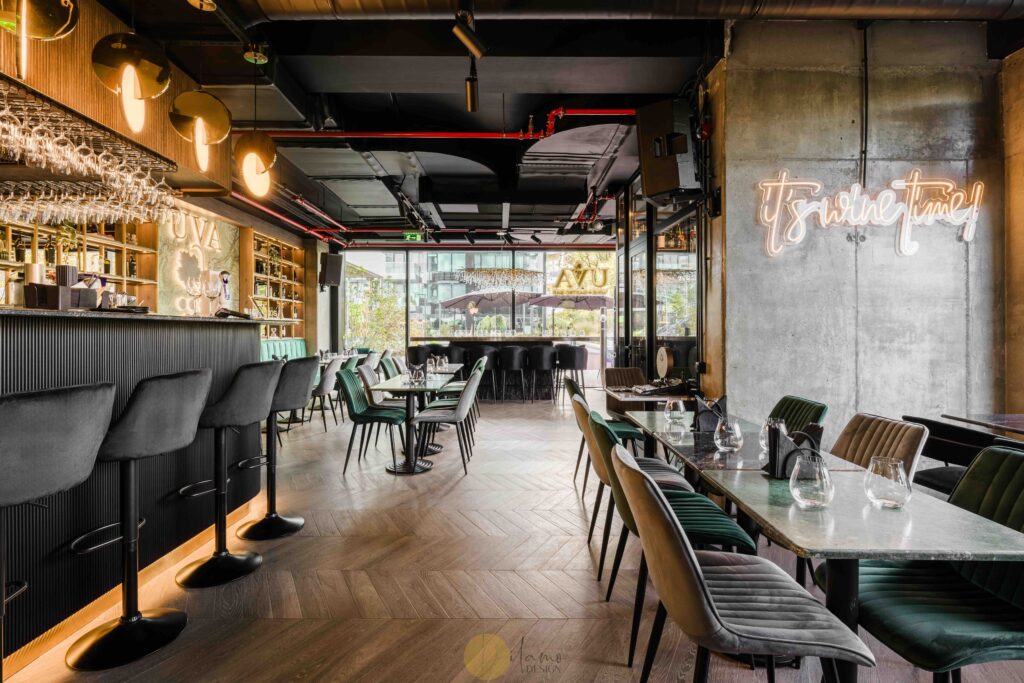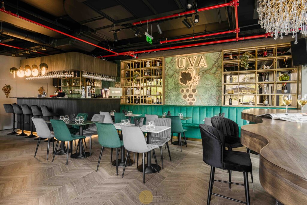 Spațiul care găzduiește UVA Wine & Gastro Bar a fost proiectat pentru a oferi un echilibru perfect între design modern și funcționalitate. Terasa generoasă și interiorul elegant creează un mediu potrivit atât pentru întâlniri casual, cât și pentru cine memorabile.