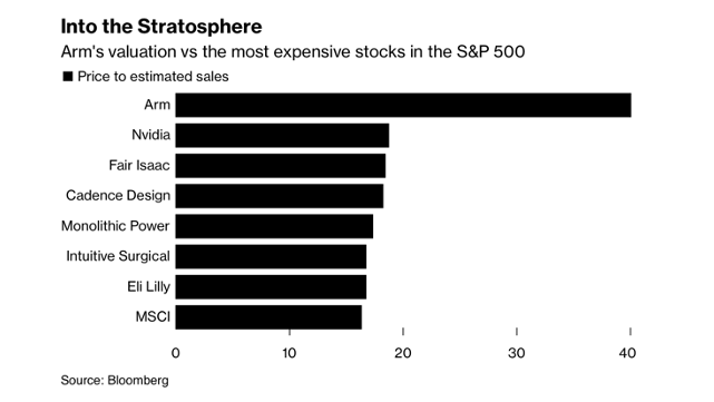 Acțiunile Arm sunt în acest moment mult mai scumpe decât orice acțiune din Nasdaq 100 sau S&P 500, inclusiv Nvidia Corp., conform datelor compilate de Bloomberg.