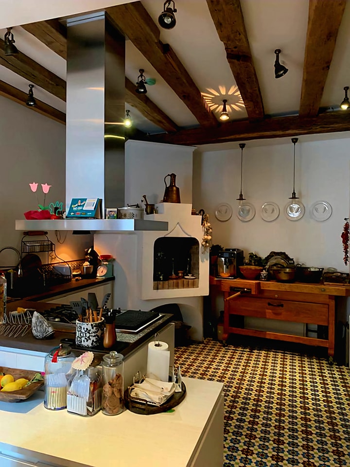 Bucătăria mobilată cu mărcile Bravo Italia/Innova, electrocasnicele Miele, frigiderul sidebyside Liebherr, cu depozitare pentru vinuri, aplicele și lampadarul Object de curiosite – Paris, cuptorul cu lemne, bancul antic de tâmplărie și ceramică Miracolor/Lamaison fac deliciul oricărui pasionat de gastronomie.