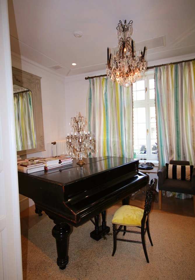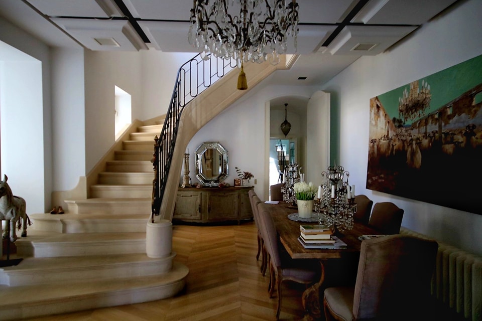 Scara principală și șemineul cu front din calcar de Vratza, care este de culoare crem, cu pete subtile, balustradele din fier forjat și terminația din bronz, prizele și întrerupătoarele Forbes, Lomax, candelabrele de bronz și sticlă, importate din Paris completează perfect atmosfera de la intrare și din sufragerie.